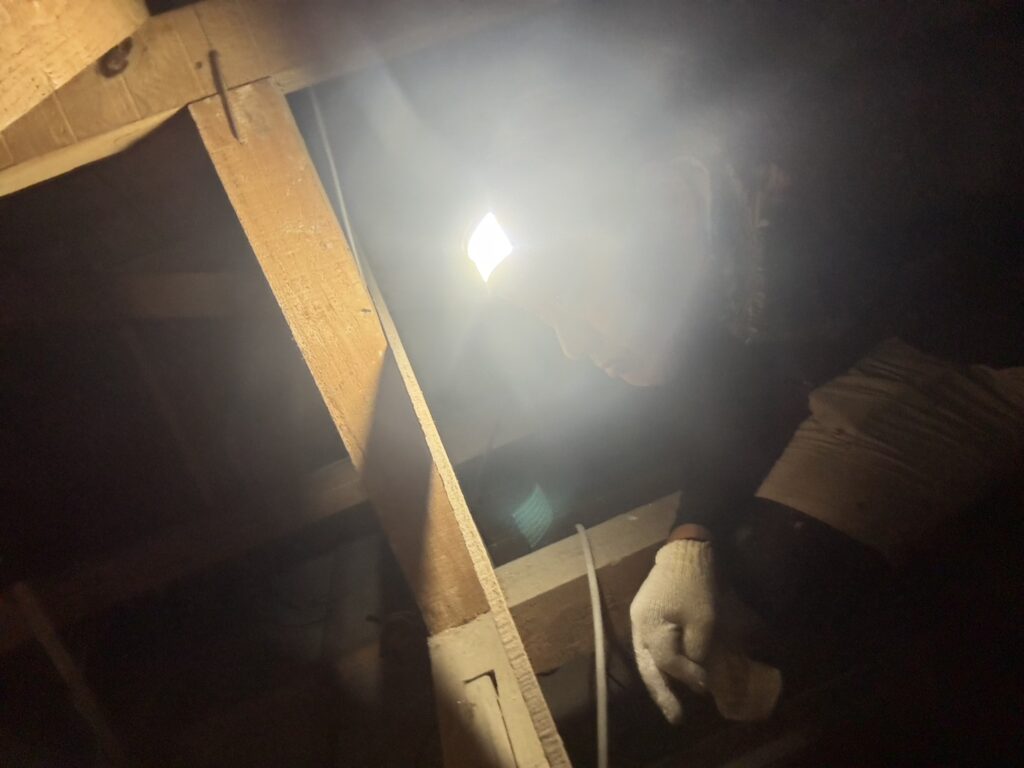 まずは一人が雨漏り箇所の屋根裏に入り、もう一人が外部の雨漏りの疑いがある箇所に水をかけて確認をします。