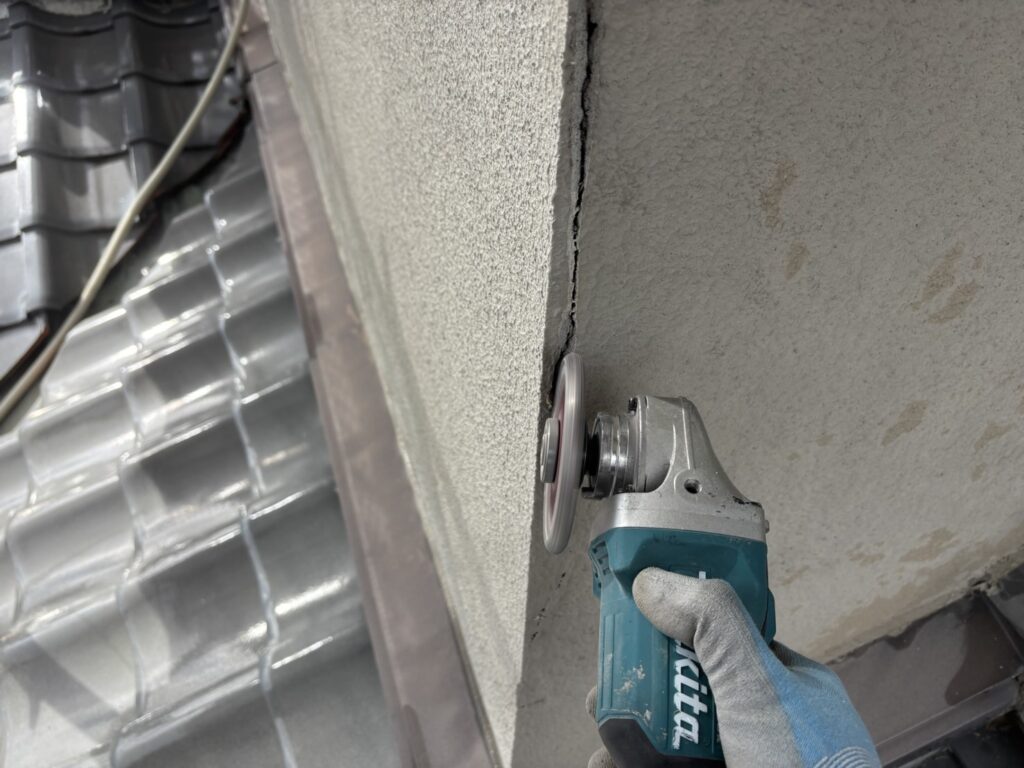 ひび割れの中までシーリング(防水材)を注入できるように、深くカットします。